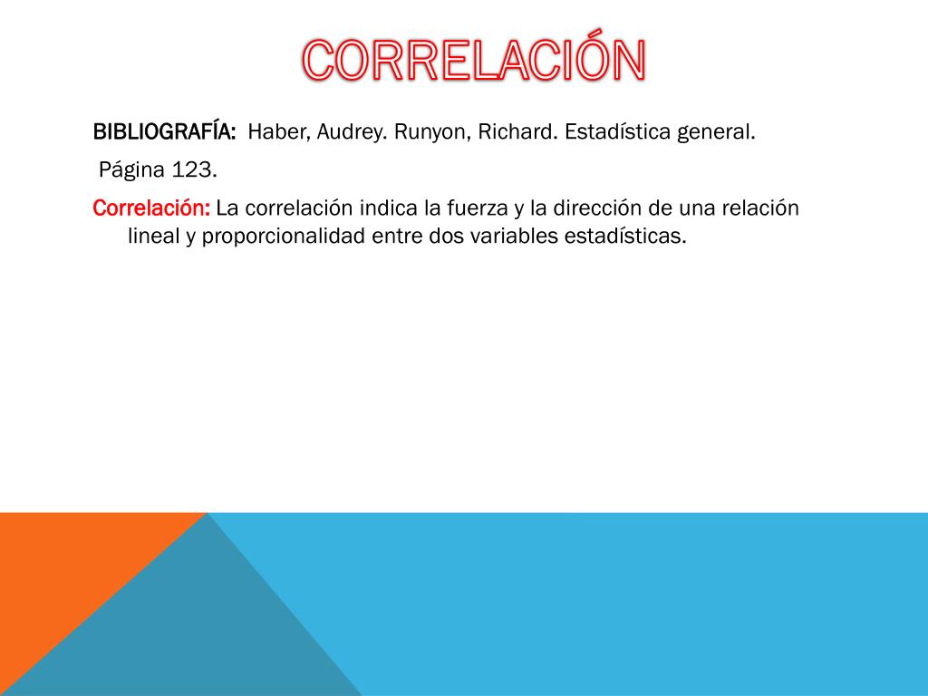 CORRELACIÓN • BIBLIOGRAFÍA: Haber, Audrey. Runyon, Richard. Estadística general. • Página 123. • Correlación: La correlación indica la fuerza y la dirección de una relación lineal y proporcionalidad entre dos variables estadísticas.