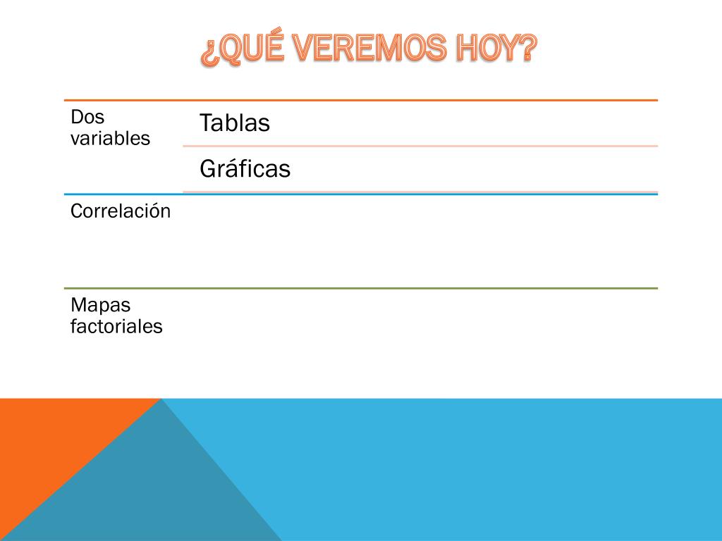 MITAD DE LA CLASE Recopilando… Presentación tabular Barra agrupada Barra apilada Barra apilada al 100% (Tarea) Covarianza