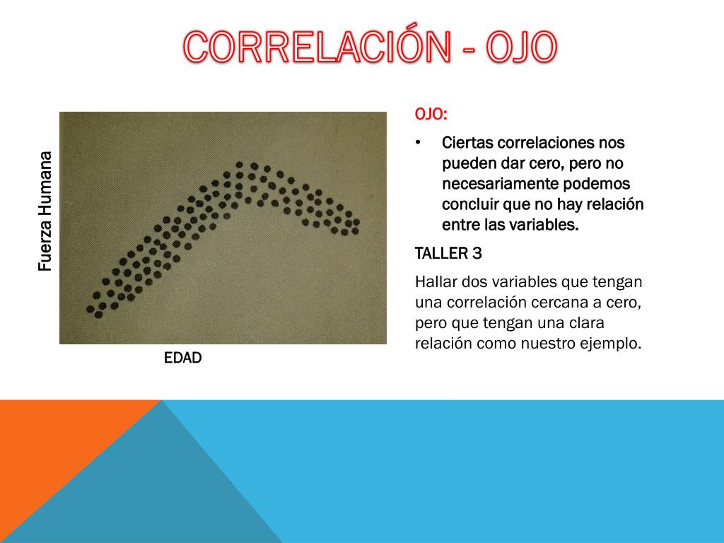 CORRELACIÓN - OJO OJO: Ciertas correlaciones nos pueden dar cero, pero no necesariamente podemos concluir que no hay relación entre las variables. TALLER 3 Hallar dos variables que tengan una correlación cercana a cero, pero que tengan una clara relación como nuestro ejemplo. Fuerza Humana EDAD