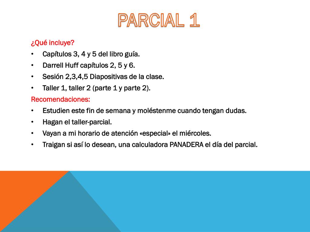 PARCIAL 1 • ¿Qué incluye? • Capítulos 3, 4 y 5 del libro guía. • DarrellHuff capítulos 2, 5 y 6. • Sesión 2,3,4,5 Diapositivas de la clase. • Taller 1, taller 2 (parte 1 y parte 2). • Recomendaciones: • Estudien este fin de semana y moléstenme cuando tengan dudas. • Hagan el taller-parcial. • Vayan a mi horario de atención «especial» el miércoles. • Traigan si así lo desean, una calculadora PANADERA el día del parcial.