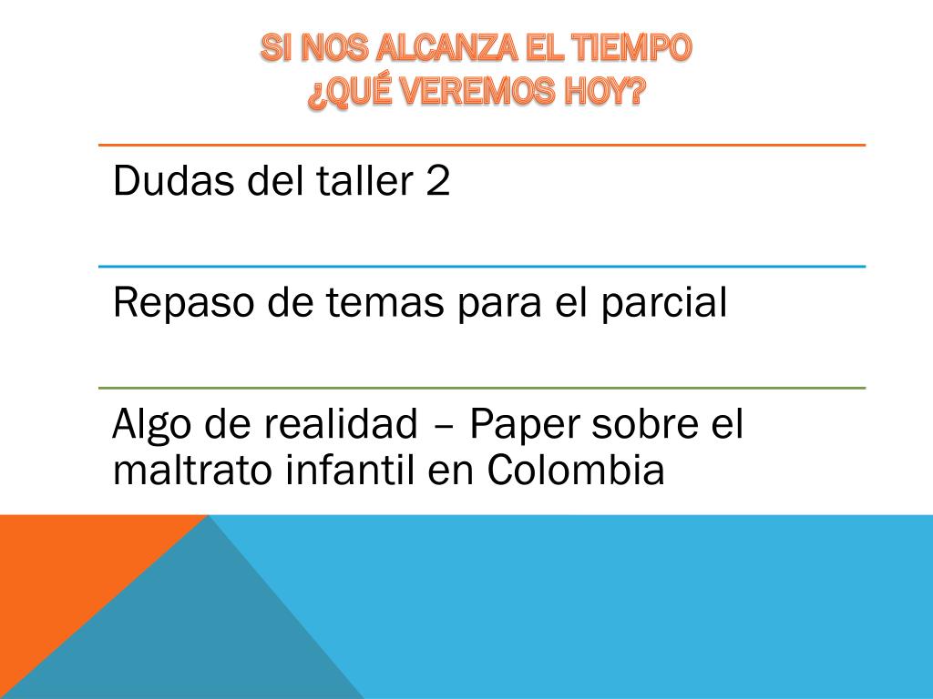 ¿Preguntas? • Tomemos lista de asistencia • Espero que hayan leído el libro de DarrellHuff (Cap. 2 5 6) • Lecturas para esta clase Cap. 9, Haber, Runyon. • El taller 2, parte 2 ya esta en la página. • Recuerden que la segunda parte incluye los ejercicios de la sesión 5. Las notas del 5% de la materia con bonos ya están la página. Primera parte del taller 2, para el martes 15 de Octubre.