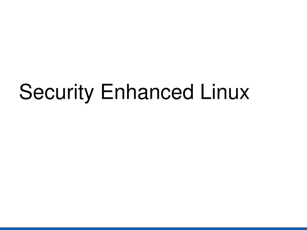 SELinux Timeline 1985: LOCK (early Type Enforcement) 1990: DTMach / DTOS 1995: Utah Fluke / Flask 1999: 2.2 Linux Kernel (patch) 2000: 2001: 2.4 Linux Kernel (patch) 2002: LSM 2003: 2.6 Linux Kernel (mainline) 2006: Full network labeling Present