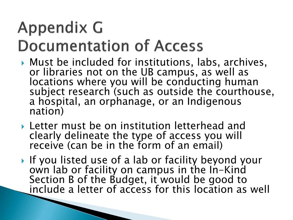 Appendix GDocumentation of Access • Must be included for institutions, labs, archives, or libraries not on the UB campus, as well as locations where you will be conducting human subject research (such as outside the courthouse, a hospital, an orphanage, or an Indigenous nation) • Letter must be on institution letterhead and clearly delineate the type of access you will receive (can be in the form of an email) • If you listed use of a lab or facility beyond your own lab or facility on campus in the In-Kind Section B of the Budget, it would be good to include a letter of access for this location as well