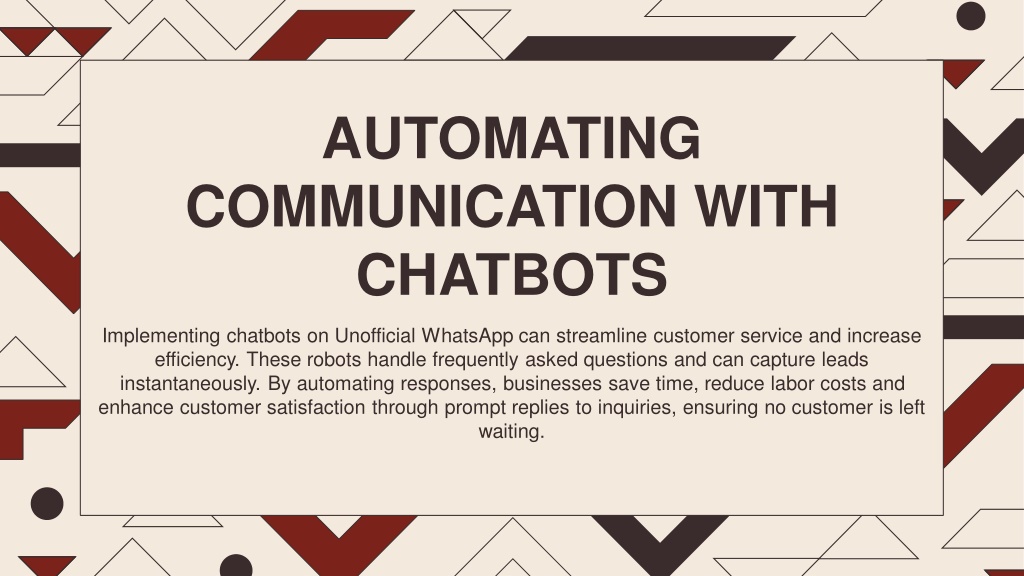 AUTOMATING COMMUNICATION WITH CHATBOTS Implementing chatbots on Unofficial WhatsApp can streamline customer service and increase efficiency. These robots handle frequently asked questions and can capture leads instantaneously. By automating responses, businesses save time, reduce labor costs and enhance customer satisfaction through prompt replies to inquiries, ensuring no customer is left waiting.