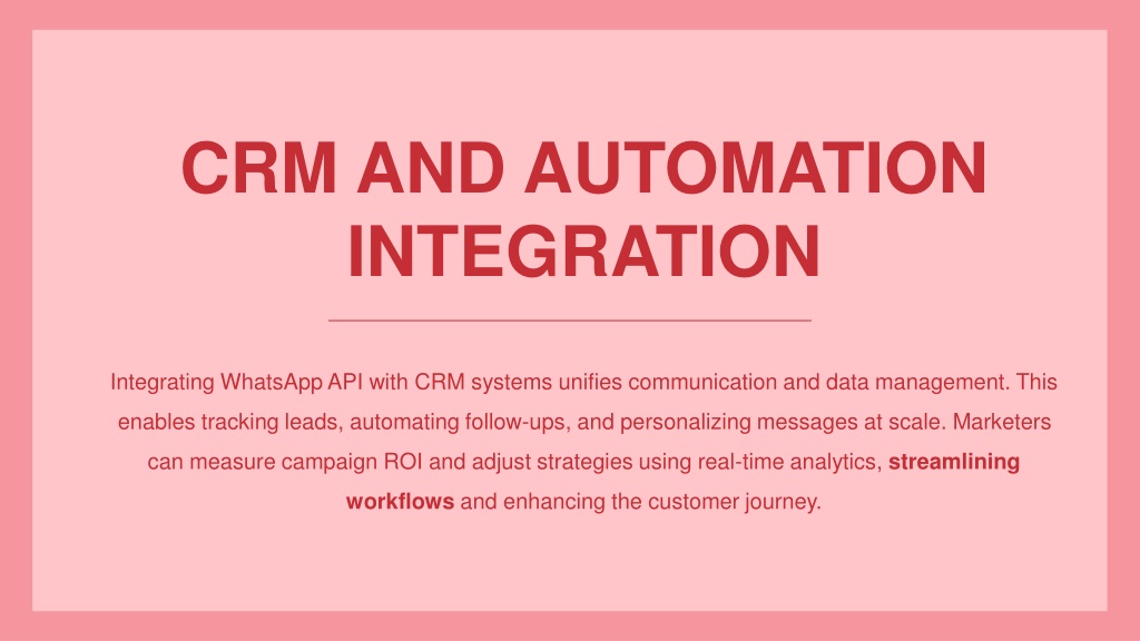 8. CRM AND AUTOMATION INTEGRATION Integrating WhatsApp API with CRM systems unifies communication and data management. This enables tracking leads, automating follow-ups, and personalizing messages at scale. Marketers can measure campaign ROI and adjust strategies using real-time analytics, streamlining workflows and enhancing the customer journey.