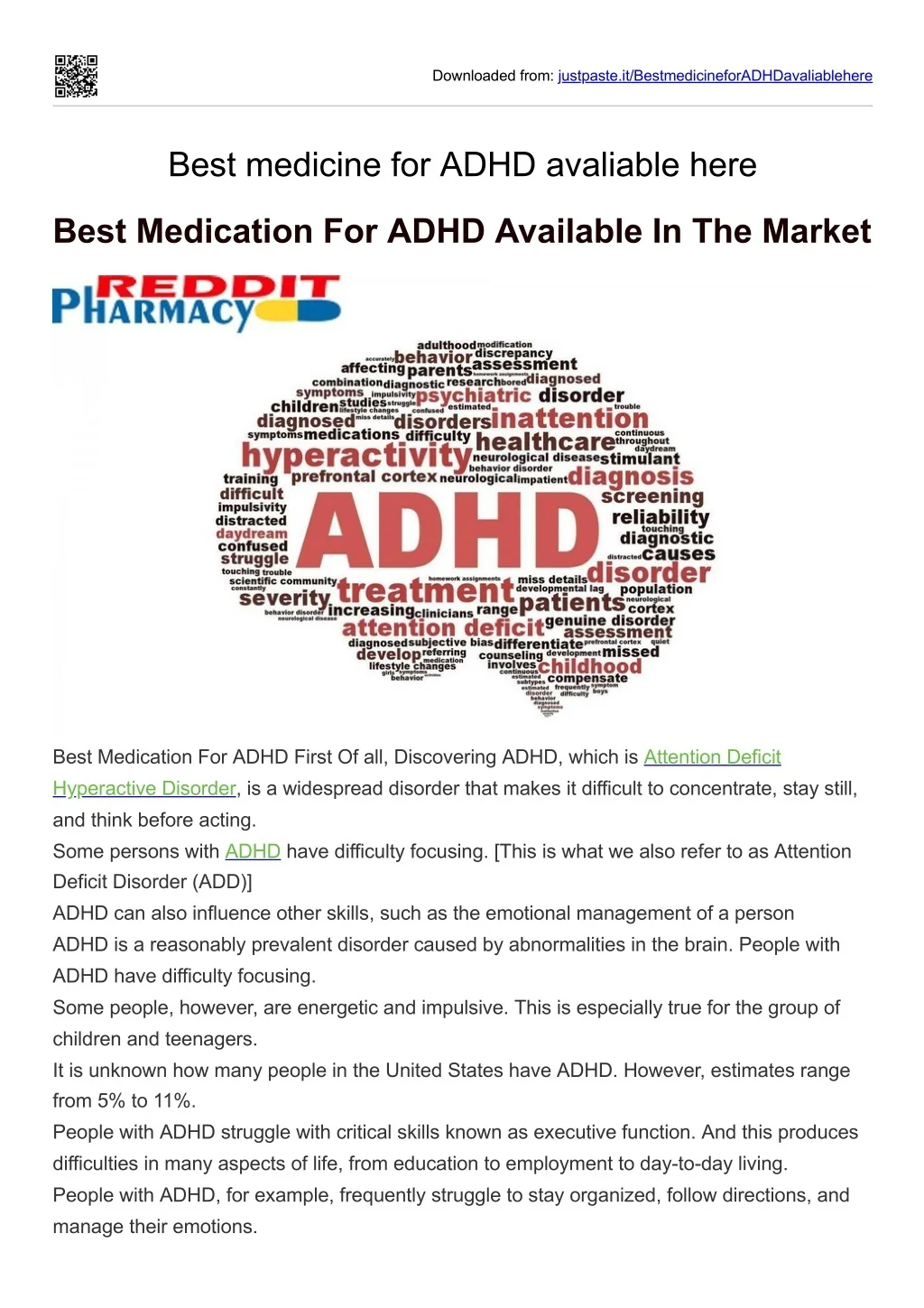Downloaded from: justpaste.it/BestmedicineforADHDavaliablehere Best medicine for ADHD avaliable here Best Medication For ADHD Available In The Market Best Medication For ADHD First Of all, Discovering ADHD, which is Attention Deficit Hyperactive Disorder, is a widespread disorder that makes it difficult to concentrate, stay still, and think before acting. Some persons with ADHD have difficulty focusing. [This is what we also refer to as Attention Deficit Disorder (ADD)] ADHD can also influence other skills, such as the emotional management of a person ADHD is a reasonably prevalent disorder caused by abnormalities in the brain. People with ADHD have difficulty focusing. Some people, however, are energetic and impulsive. This is especially true for the group of children and teenagers. It is unknown how many people in the United States have ADHD. However, estimates range from 5% to 11%. People with ADHD struggle with critical skills known as executive function. And this produces difficulties in many aspects of life, from education to employment to day-to-day living. People with ADHD, for example, frequently struggle to stay organized, follow directions, and manage their emotions.