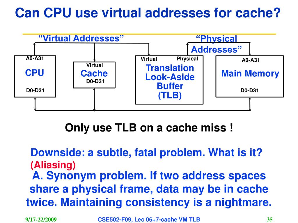 Can CPU use virtual addresses for cache? “Virtual Addresses” “Physical Addresses” A0-A31 Physical Virtual A0-A31 Translation Look-Aside Buffer (TLB) Virtual Cache CPU Main Memory D0-D31 D0-D31 D0-D31 Only use TLB on a cache miss ! Downside: a subtle, fatal problem. What is it? (Aliasing) A. Synonym problem. If two address spaces share a physical frame, data may be in cache twice. Maintaining consistency is a nightmare. CSE502-F09, Lec 06+7-cache VM TLB