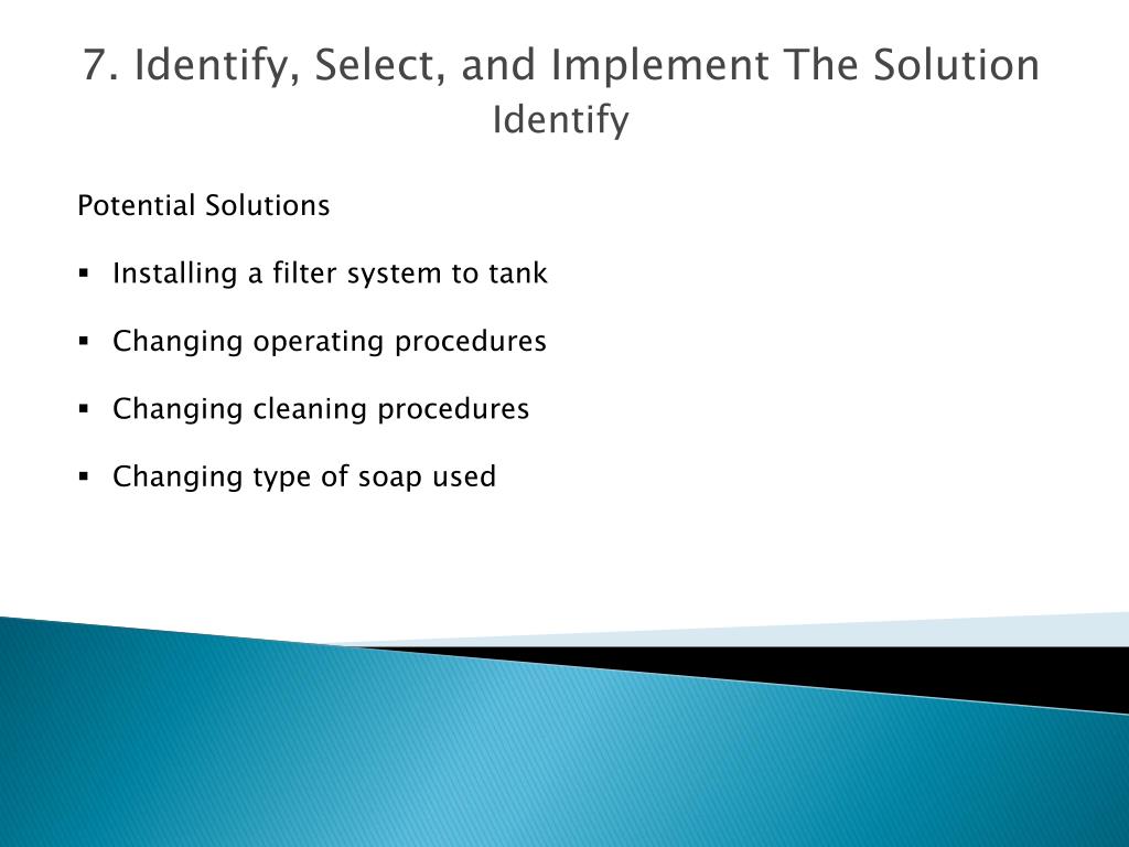 Potential Solutions • Installing a filter system to tank • Changing operating procedures • Changing cleaning procedures • Changing type of soap used 7. Identify, Select, and Implement The Solution Identify