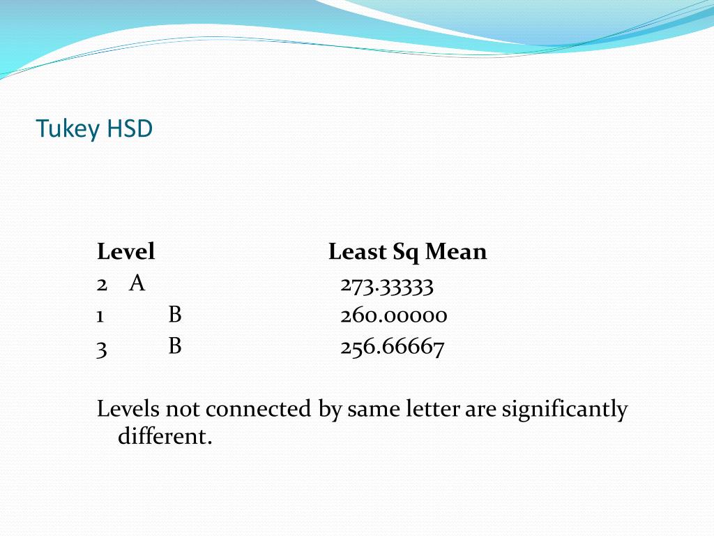 Tukey HSD Level Least Sq Mean 2 A 273.33333 1 B 260.00000 3 B 256.66667 Levels not connected by same letter are significantly different.