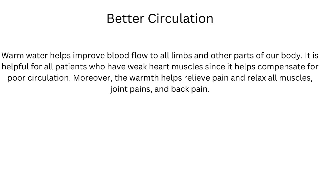 Better Circulation Warm water helps improve blood flow to all limbs and other parts of our body. It is helpful for all patients who have weak heart muscles since it helps compensate for poor circulation. Moreover, the warmth helps relieve pain and relax all muscles, joint pains, and back pain.