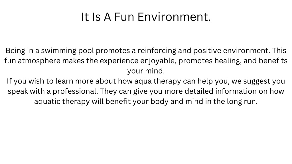 It Is A Fun Environment. Being in a swimming pool promotes a reinforcing and positive environment. This fun atmosphere makes the experience enjoyable, promotes healing, and benefits your mind. If you wish to learn more about how aqua therapy can help you, we suggest you speak with a professional. They can give you more detailed information on how aquatic therapy will benefit your body and mind in the long run.