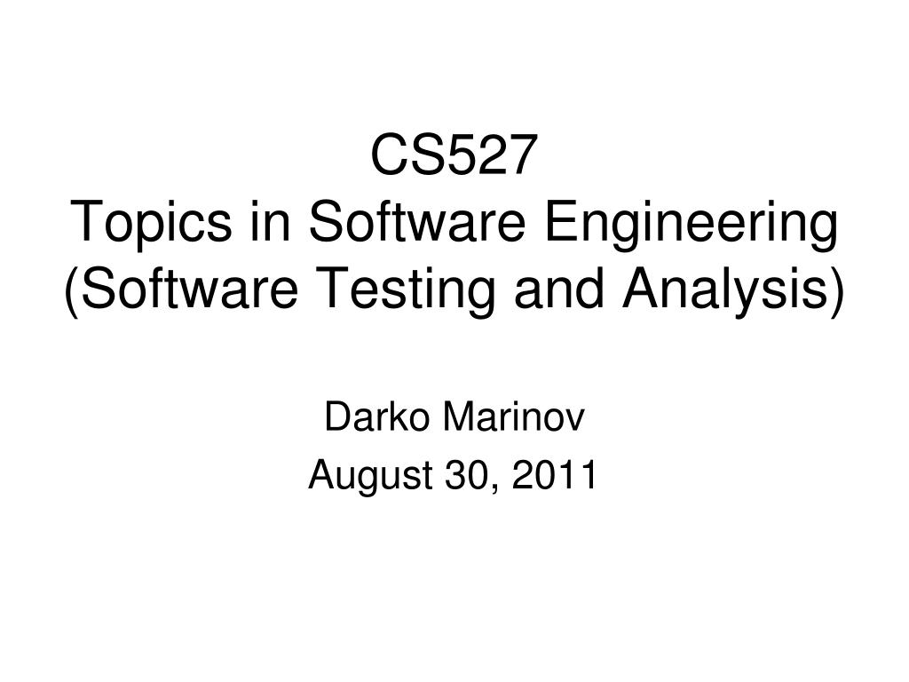 CS527 Topics in Software Engineering (Software Testing and Analysis). Darko Marinov August 30, 2011. Course Info. Everyone on the mailing list and “People” Hopefully no more registration changes Coursework PROJECT [40%] Already received some proposals Presentation [20%]