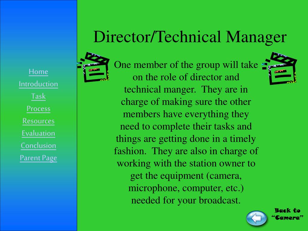 Director/Technical Manager One member of the group will take on the role of director and technical manger. They are in charge of making sure the other members have everything they need to complete their tasks and things are getting done in a timely fashion. They are also in charge of working with the station owner to get the equipment (camera, microphone, computer, etc.) needed for your broadcast. Back to “Camera”