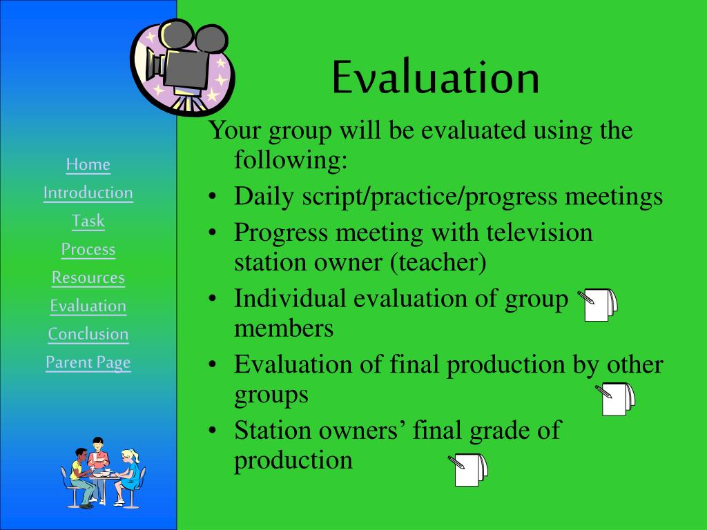 Evaluation Your group will be evaluated using the following: • Daily script/practice/progress meetings • Progress meeting with television station owner (teacher) • Individual evaluation of group members • Evaluation of final production by other groups • Station owners’ final grade of production