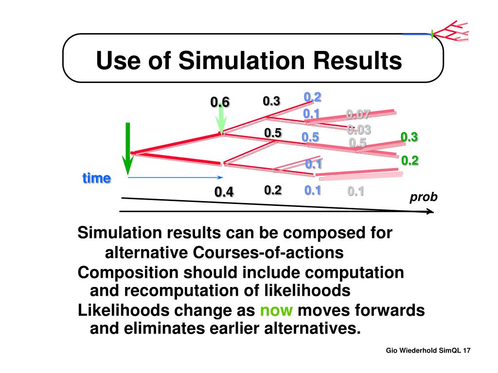 0.2 0.3 0.6 0.1 0.07 0.03 0.5 0.5 0.3 0.5 0.2 0.1 time 0.2 0.1 0.1 0.4 prob Use of Simulation Results Simulation results can be composed for alternative Courses-of-actions Composition should include computation and recomputation of likelihoods Likelihoods change as now moves forwards and eliminates earlier alternatives.