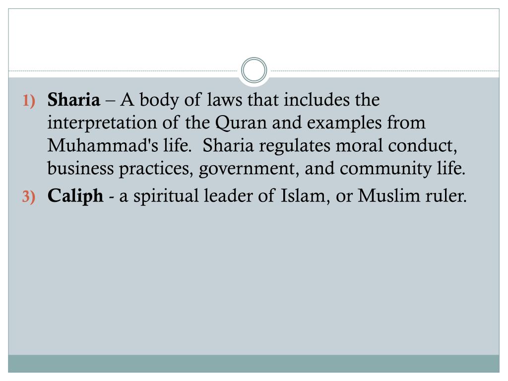 Sharia – A body of laws that includes the interpretation of the Quran and examples from Muhammad's life. Sharia regulates moral conduct, business practices, government, and community life. • Caliph - a spiritual leader of Islam, or Muslim ruler.