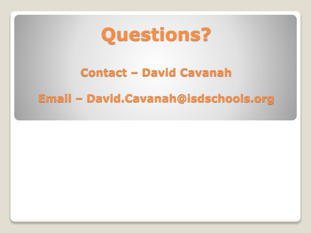 Questions?Contact – David CavanahEmail – David.Cavanah@isdschools.org