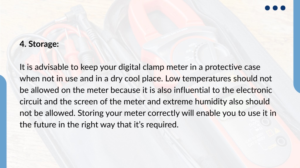 4. Storage: It is advisable to keep your digital clamp meter in a protective case when not in use and in a dry cool place. Low temperatures should not be allowed on the meter because it is also influential to the electronic circuit and the screen of the meter and extreme humidity also should not be allowed. Storing your meter correctly will enable you to use it in the future in the right way that it’s required.