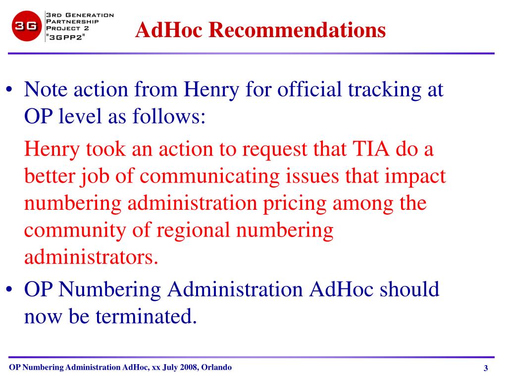 AdHoc Progress (2) • Consideration of additional strategies: • In response to the ACTIONs above, TIA is requested to provide a summaryexplanation of the reason for the changes in fee structure. This response is requested as soon as possible. • TIA is requested to provide a periodic overview of the financial status to of Numbering Administration operation to all applicable global administrators with specific indicators on why and when fee changes are projected including the amount or range of fee change that is being considered. • OP should get acquainted with the effect of the changes in the fee structure, such as improvement of TIA’s financial situation, sustainability, consistency and so on, to obtain common prospects for the Numbering Administration activities among the OPs, and to clarify whether further changes would be needed. The fact that Numbering Administration is outside the scope of 3GPP2 was raised. In addition, Henry noted that, although customer satisfaction is a major concern, the realities of management of dissipating do have certain costs and these costs get worse as the scarcity increases. He also projected that annual price increases around the August timeframe ACTION: Henry took an action to request that TIA do a better job of communicating issues that impact numbering administration pricing among the community of regional numbering administrators.