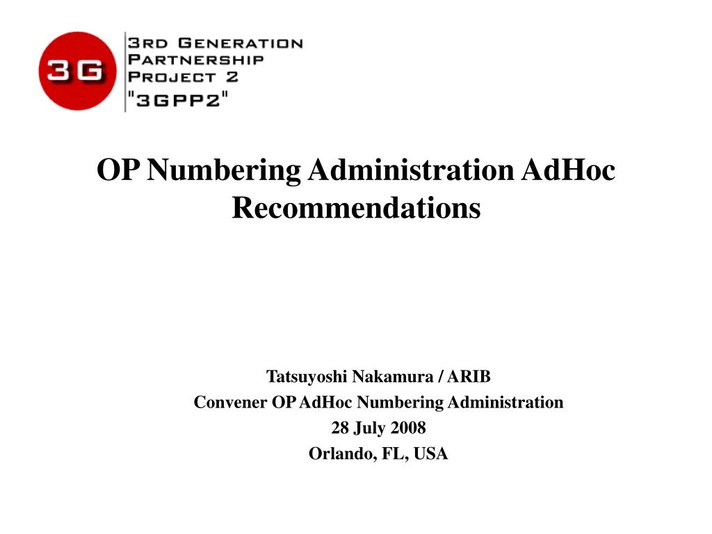 OP Numbering Administration AdHoc Recommendations Tatsuyoshi Nakamura / ARIB Convener OP AdHoc Numbering Administration 28 July 2008 Orlando, FL, USA
