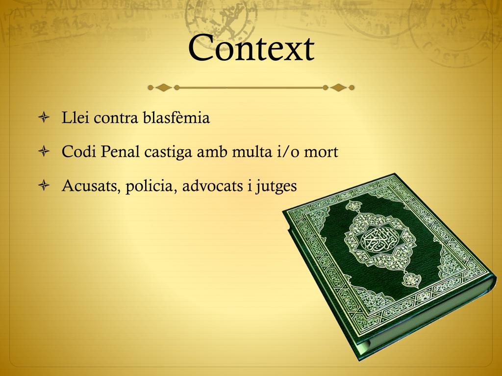 Context Llei contra blasfèmia Codi Penal castiga amb multa i/o mort Acusats, policia, advocats i jutges