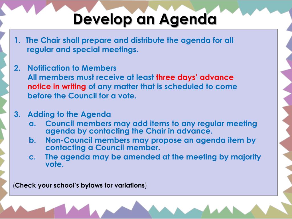 Develop an Agenda 1. The Chair shall prepare and distribute the agenda for all regular and special meetings. 2. Notification to Members All members must receive at leastthree days’ advance notice in writingof any matter that is scheduled to come before the Council for a vote. 3. Adding to the Agenda • Council members may add items to any regular meeting agenda by contacting the Chair in advance. • Non-Council members may propose an agenda item by contacting a Council member. • The agenda may be amended at the meeting by majority vote. (Check your school’s bylaws for variations)