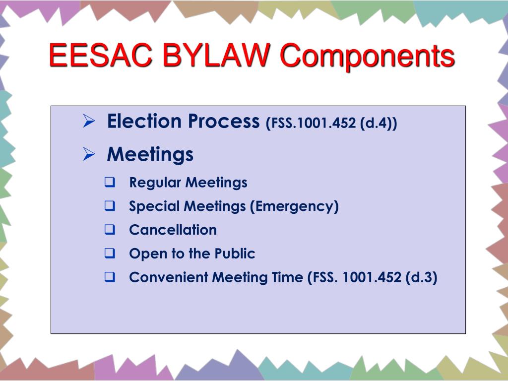 EESAC BYLAW Components • Election Process (FSS.1001.452 (d.4)) • Meetings • Regular Meetings • Special Meetings (Emergency) • Cancellation • Open to the Public • Convenient Meeting Time (FSS. 1001.452 (d.3)