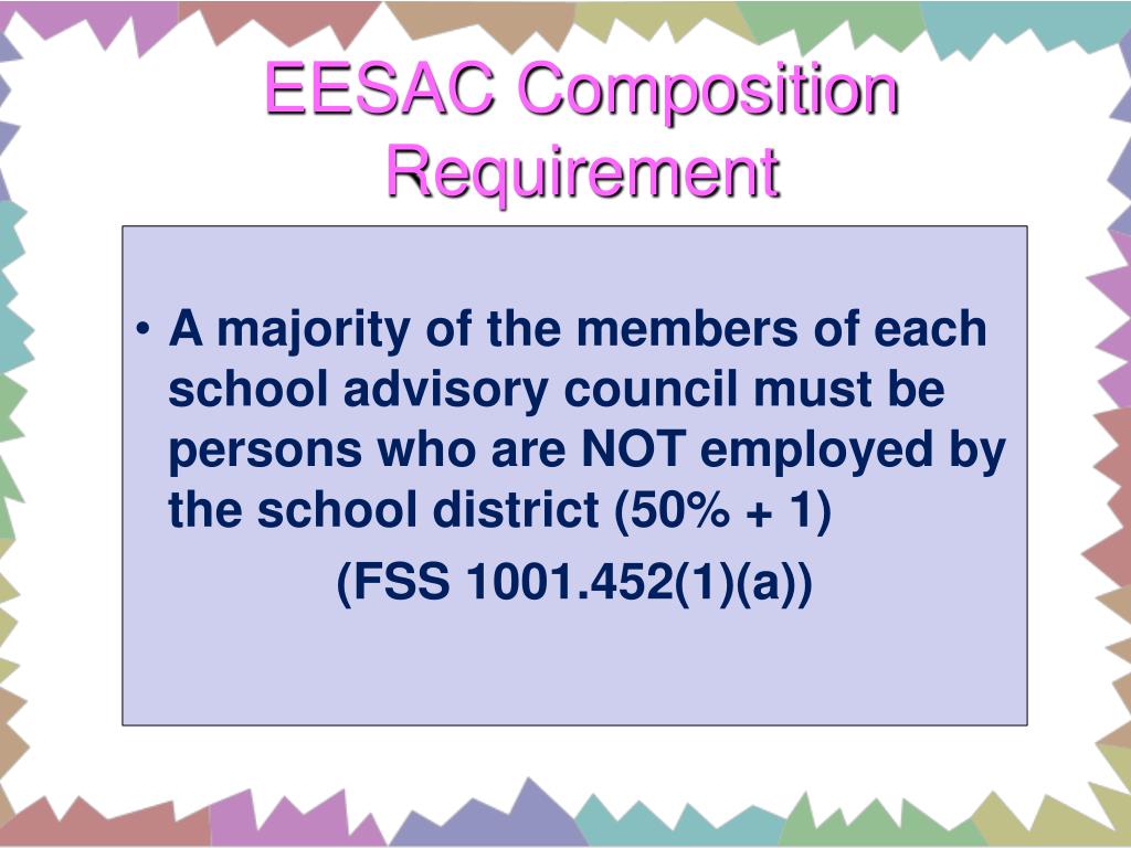 EESAC Composition Requirement • A majority of the members of each school advisory council must be persons who are NOT employed by the school district (50% + 1) • (FSS 1001.452(1)(a))
