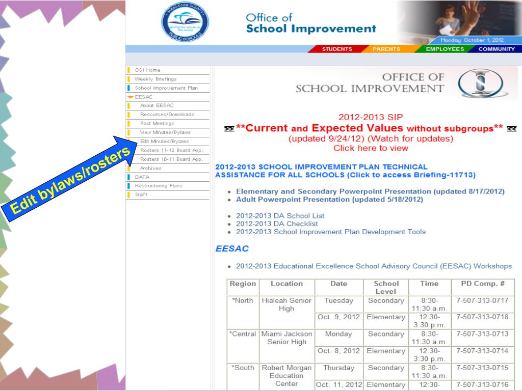 Office of School Improvement October 2012. 2012-2013 EDUCATIONAL EXCELLENCE SCHOOL ADVISORY COUNCIL TRAINING. EESAC 101- What you need to know…. OUR STUDENTS’ SUCCESSES. Objectives. Communicate EESAC roles and responsibilities Provide tools and resources to ensure compliance