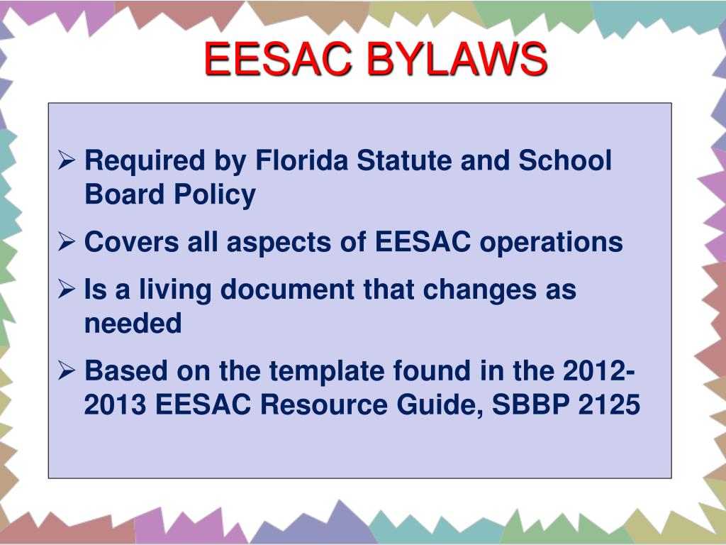 EESAC BYLAWS • Required by Florida Statute and School Board Policy • Covers all aspects of EESAC operations • Is a living document that changes as needed • Based on the template found in the 2012-2013 EESAC Resource Guide, SBBP 2125