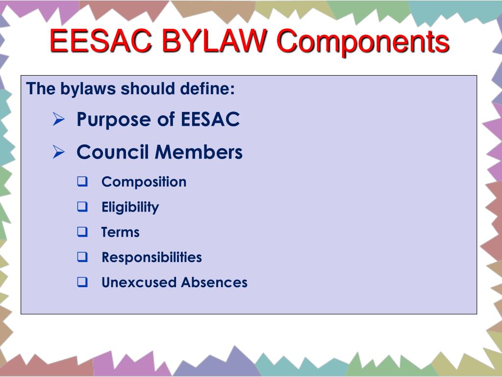 EESAC BYLAW Components • The bylaws should define: • Purpose of EESAC • Council Members • Composition • Eligibility • Terms • Responsibilities • Unexcused Absences