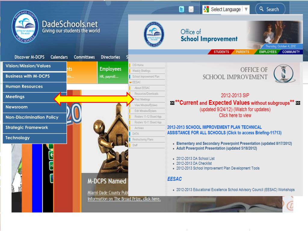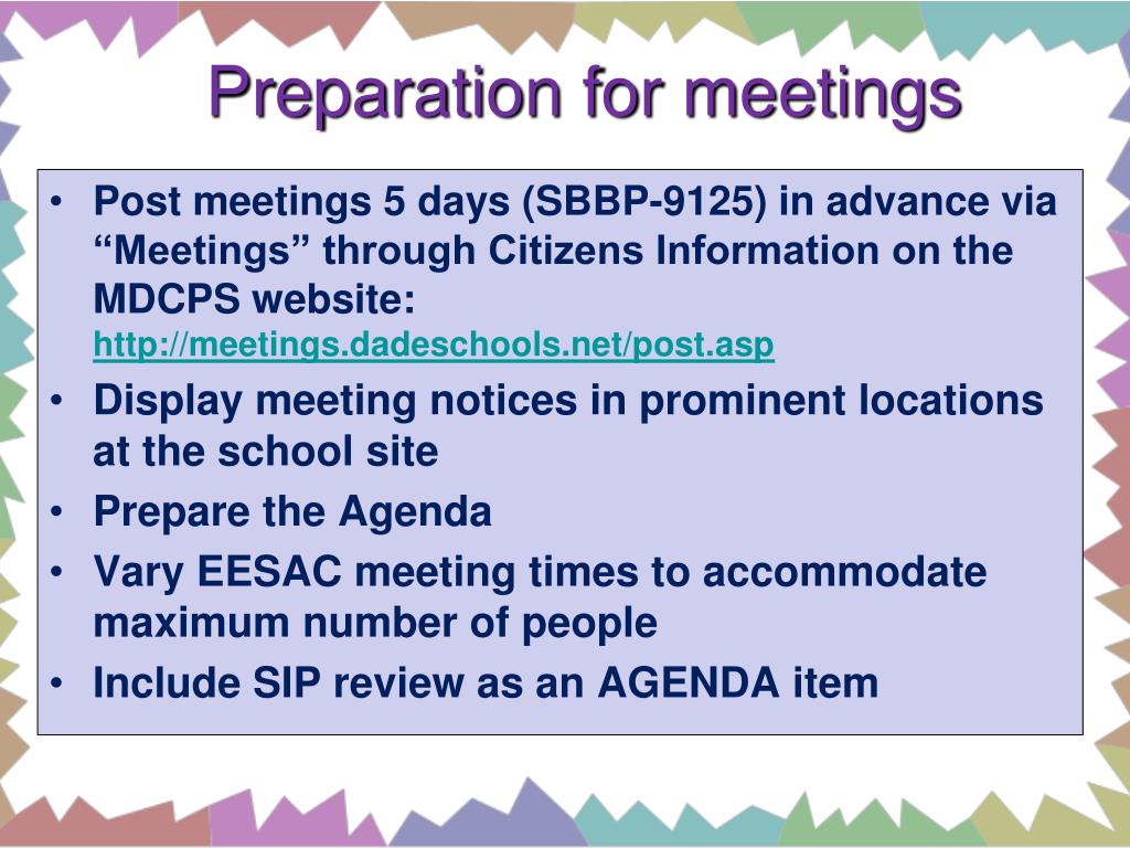Preparation for meetings • Post meetings 5 days (SBBP-9125) in advance via “Meetings” through Citizens Information on the MDCPS website: http://meetings.dadeschools.net/post.asp • Display meeting notices in prominent locations at the school site • Prepare the Agenda • Vary EESAC meeting times to accommodate maximum number of people • Include SIP review as an AGENDA item