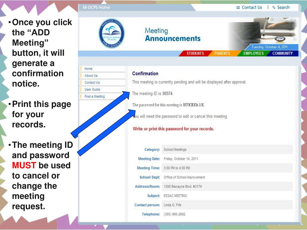 Once you click the “ADD Meeting” button, it will generate a confirmation notice. • Print this page for your records. • The meeting ID and password MUST be used to cancel or change the meeting request.
