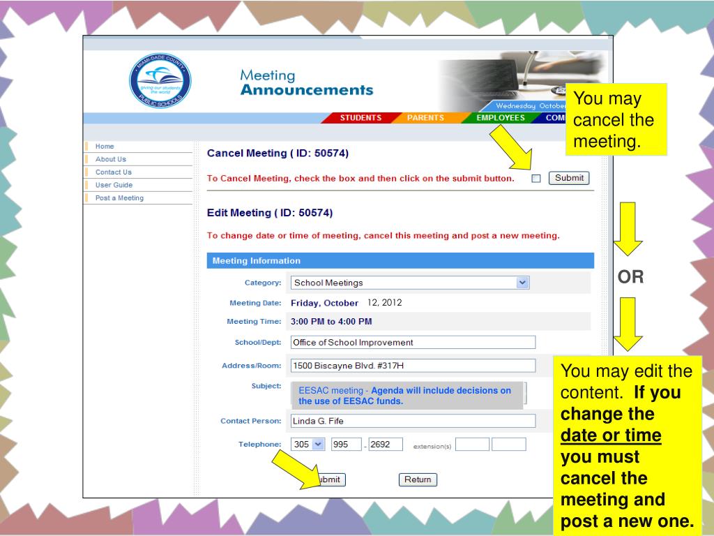 You may cancel the meeting. OR 12, 2012 You may edit the content. If you change the date or time you must cancel the meeting and post a new one. EESAC meeting - Agenda will include decisions on the use of EESAC funds.
