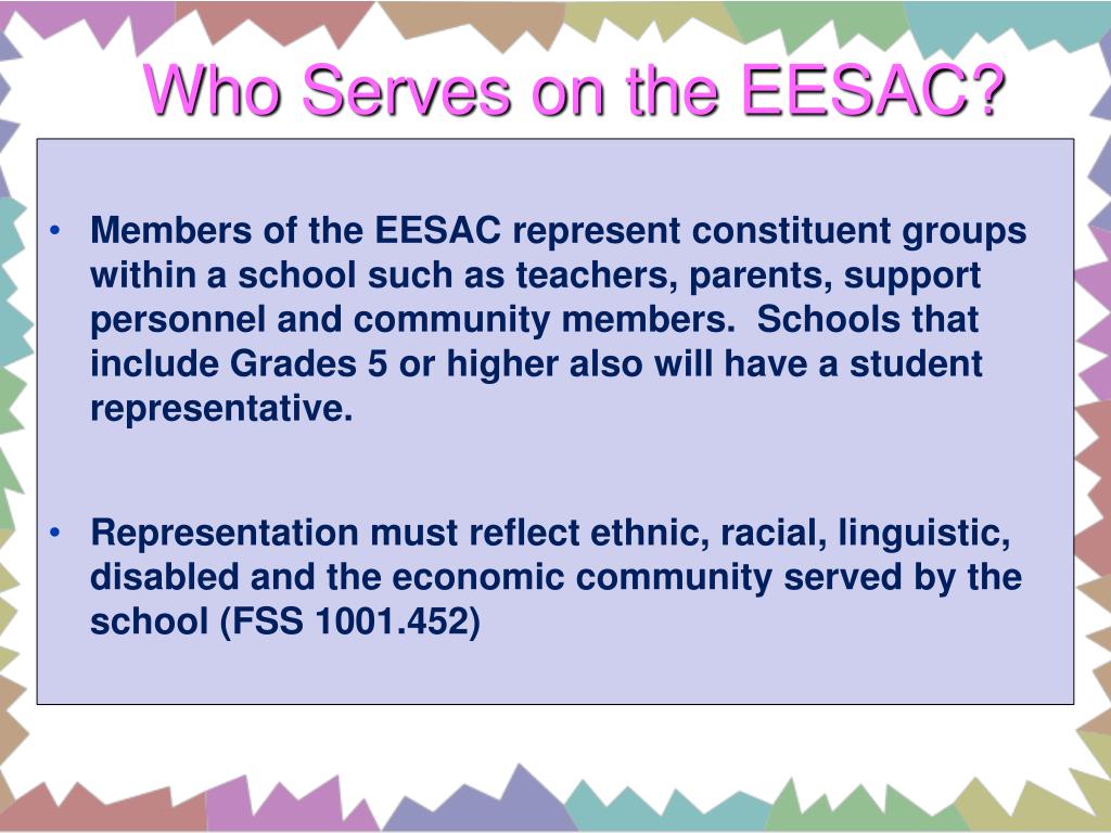 Who Serves on the EESAC? • Members of the EESAC represent constituent groups within a school such as teachers, parents, support personnel and community members. Schools that include Grades 5 or higher also will have a student representative. • Representation must reflect ethnic, racial, linguistic, disabled and the economic community served by the school (FSS 1001.452)