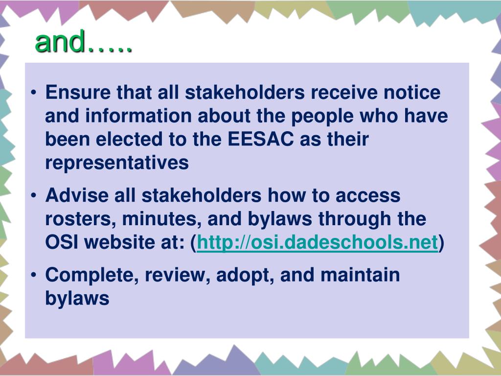 and….. • Ensure that all stakeholders receive notice and information about the people who have been elected to the EESAC as their representatives • Advise all stakeholders how to access rosters, minutes, and bylaws through the OSI website at: (http://osi.dadeschools.net) • Complete, review, adopt, and maintain bylaws