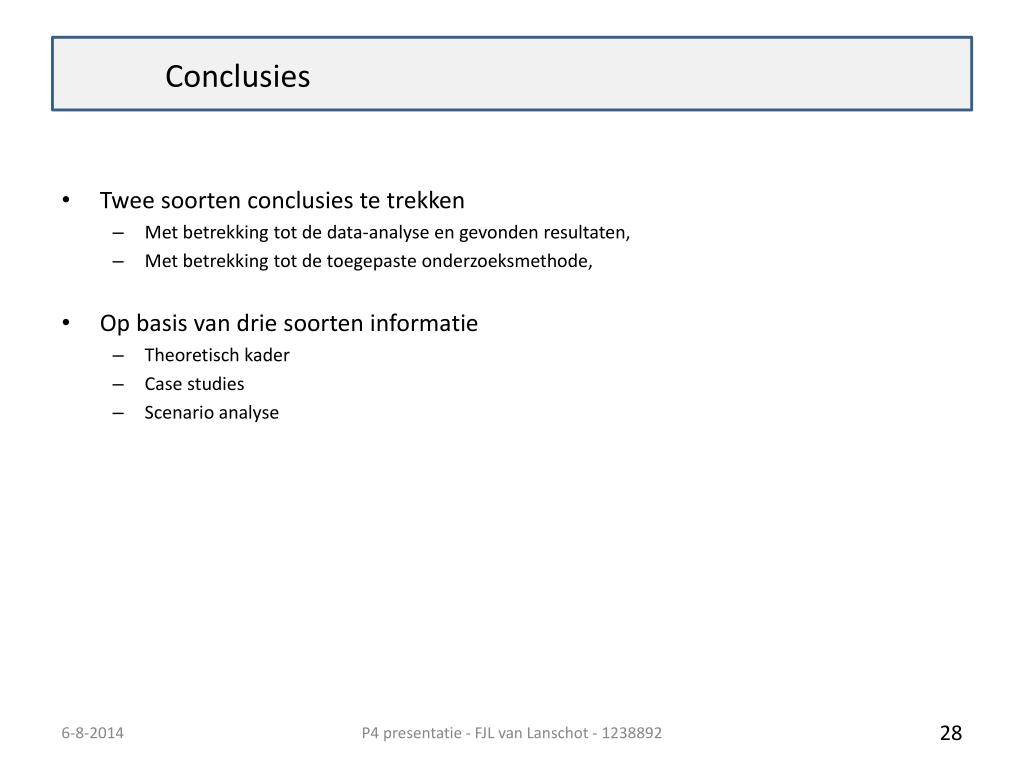 Conclusies Conclusies • Twee soorten conclusies te trekken • Met betrekking tot de data-analyse en gevonden resultaten, • Met betrekking tot de toegepaste onderzoeksmethode, • Op basis van drie soorten informatie • Theoretisch kader • Case studies • Scenario analyse P4 presentatie - FJL van Lanschot - 1238892