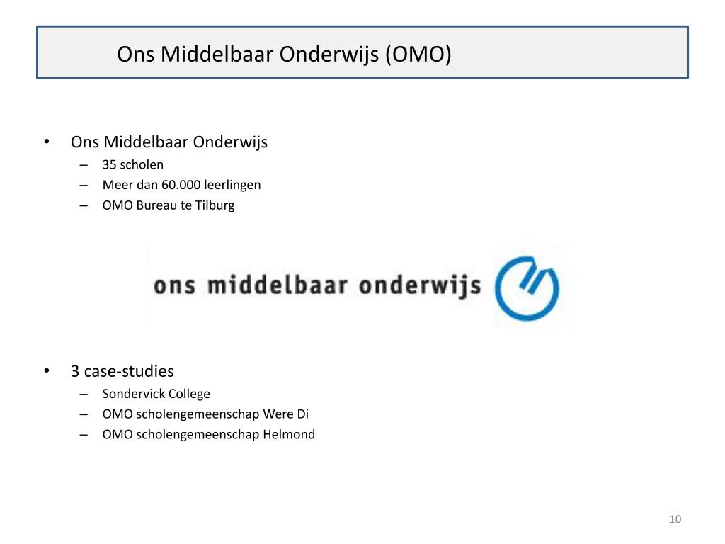 Ons Middelbaar Onderwijs (OMO) • Ons Middelbaar Onderwijs • 35 scholen • Meer dan 60.000 leerlingen • OMO Bureau te Tilburg • 3 case-studies • Sondervick College • OMO scholengemeenschap Were Di • OMO scholengemeenschap Helmond