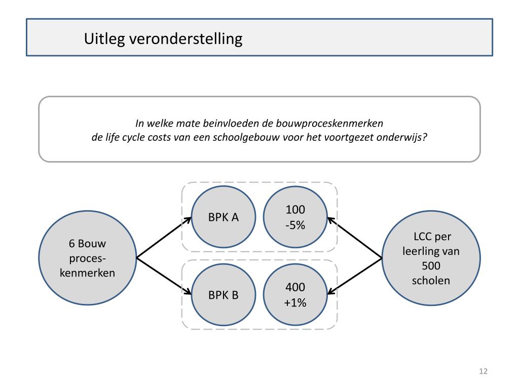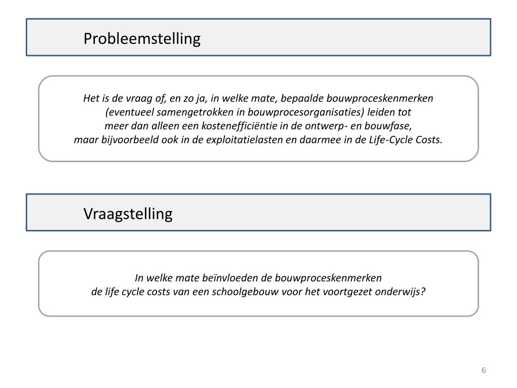 Probleemstelling Het is de vraag of, en zo ja, in welke mate, bepaalde bouwproceskenmerken (eventueel samengetrokken in bouwprocesorganisaties) leiden tot meer dan alleen een kostenefficiëntie in de ontwerp- en bouwfase, maar bijvoorbeeld ook in de exploitatielasten en daarmee in de Life-Cycle Costs. Vraagstelling In welke mate beïnvloeden de bouwproceskenmerken de life cycle costs van een schoolgebouw voor het voortgezet onderwijs?