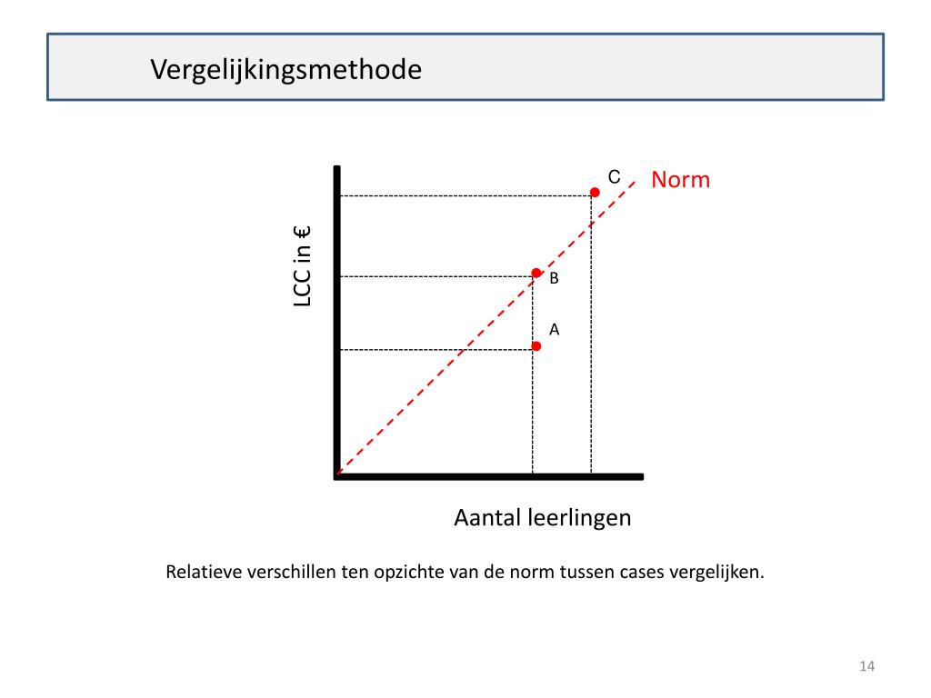 Vergelijkingsmethode Norm C Relatieve verschillen ten opzichte van de norm tussen cases vergelijken. LCC in € B A Aantal leerlingen