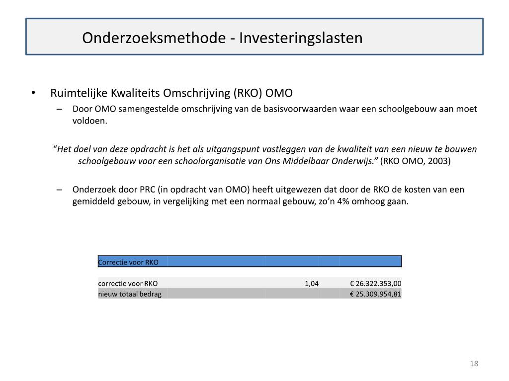 Onderzoeksmethode - Investeringslasten • Ruimtelijke Kwaliteits Omschrijving (RKO) OMO • Door OMO samengestelde omschrijving van de basisvoorwaarden waar een schoolgebouw aan moet voldoen. “Het doel van deze opdracht is het als uitgangspunt vastleggen van de kwaliteit van een nieuw te bouwen schoolgebouw voor een schoolorganisatie van Ons Middelbaar Onderwijs.” (RKO OMO, 2003) • Onderzoek door PRC (in opdracht van OMO) heeft uitgewezen dat door de RKO de kosten van een gemiddeld gebouw, in vergelijking met een normaal gebouw, zo’n 4% omhoog gaan.
