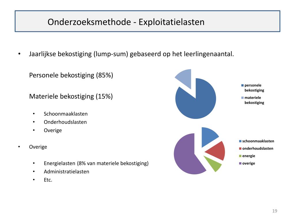 Onderzoeksmethode - Exploitatielasten • Jaarlijkse bekostiging (lump-sum)gebaseerd op het leerlingenaantal. • Personelebekostiging (85%) • Materielebekostiging (15%) • Schoonmaaklasten • Onderhoudslasten • Overige • Overige • Energielasten (8% van materielebekostiging) • Administratielasten • Etc.