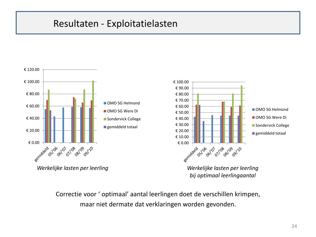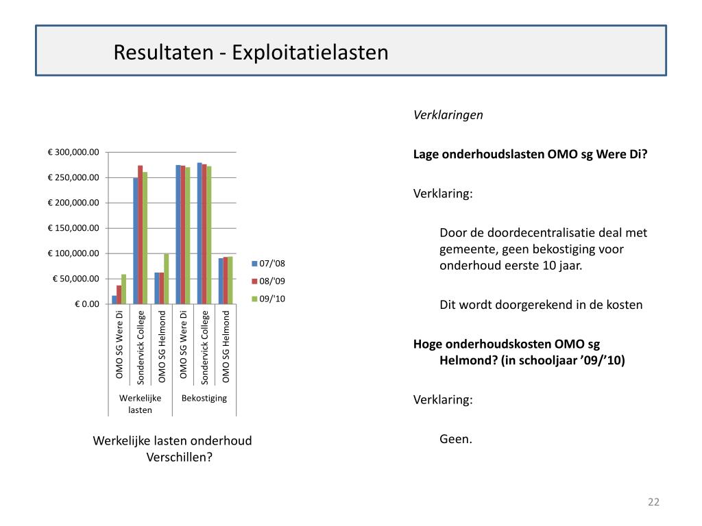 Resultaten - Exploitatielasten Verklaringen Lageonderhoudslasten OMO sg Were Di? Verklaring: Door de doordecentralisatie deal met gemeente, geenbekostigingvooronderhoudeerste 10 jaar. Ditwordtdoorgerekend in de kosten Hogeonderhoudskosten OMO sgHelmond? (in schooljaar ’09/’10) Verklaring: Geen. Werkelijkelastenonderhoud Verschillen?