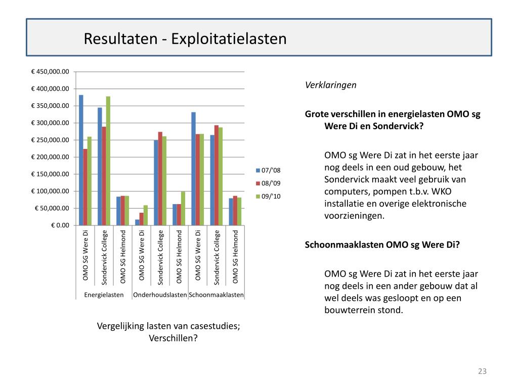 Resultaten - Exploitatielasten Verklaringen Grote verschillen in energielasten OMO sg Were Di en Sondervick? OMO sg Were Di zat in het eerstejaarnogdeels in eenoudgebouw, het Sondervickmaaktveelgebruik van computers, pompent.b.v. WKO installatie en overigeelektronischevoorzieningen. Schoonmaaklasten OMO sg Were Di? OMO sg Were Di zat in het eerstejaarnogdeels in eenandergebouwdat al weldeels was gesloopt en op eenbouwterreinstond. Vergelijkinglasten van casestudies; Verschillen?