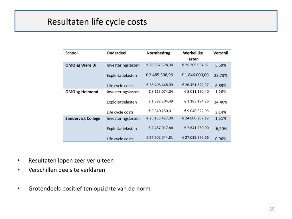 Resultaten life cycle costs • Resultatenlopenzeerveruiteen • Verschillendeelsteverklaren • Grotendeelspositief ten opzichte van de norm