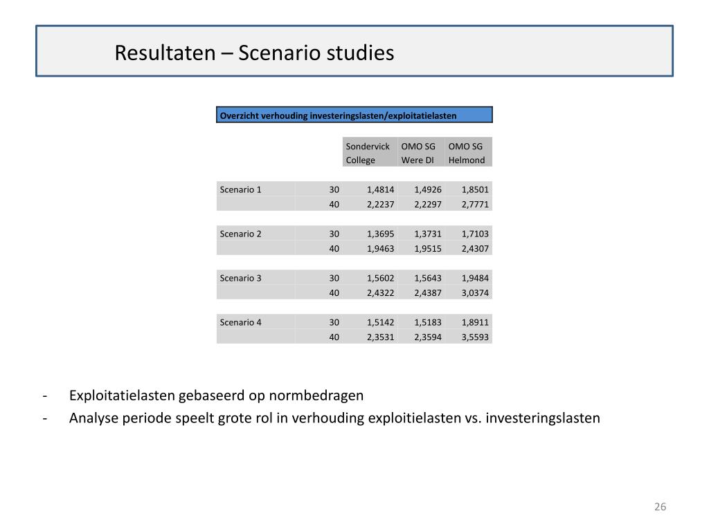 Resultaten – Scenario studies • Exploitatielasten gebaseerd op normbedragen • Analyseperiodespeeltgroterol in verhoudingexploitielasten vs. investeringslasten