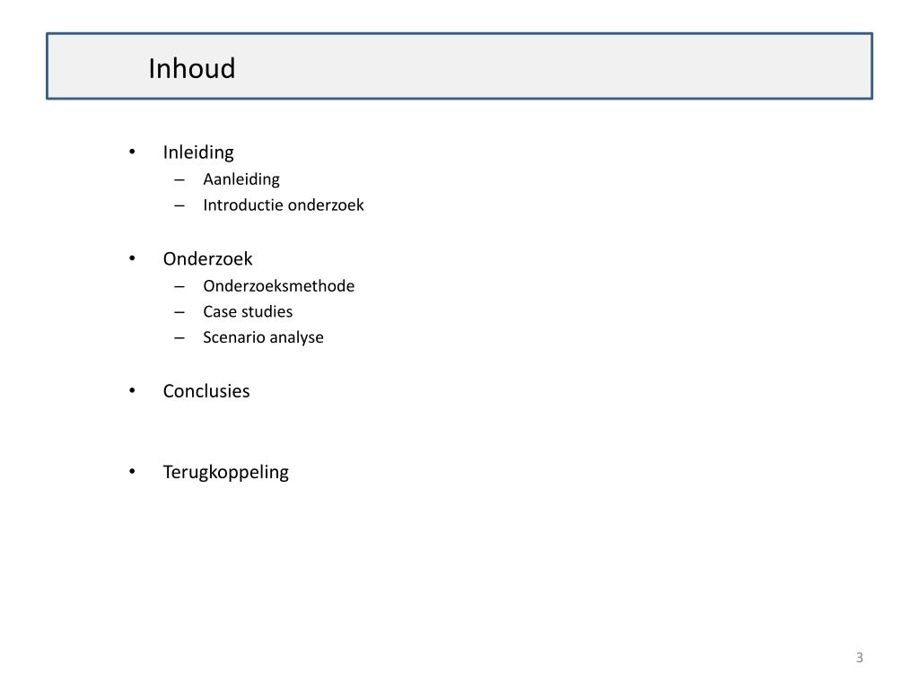 Inhoud • Inleiding • Aanleiding • Introductie onderzoek • Onderzoek • Onderzoeksmethode • Case studies • Scenario analyse • Conclusies • Terugkoppeling