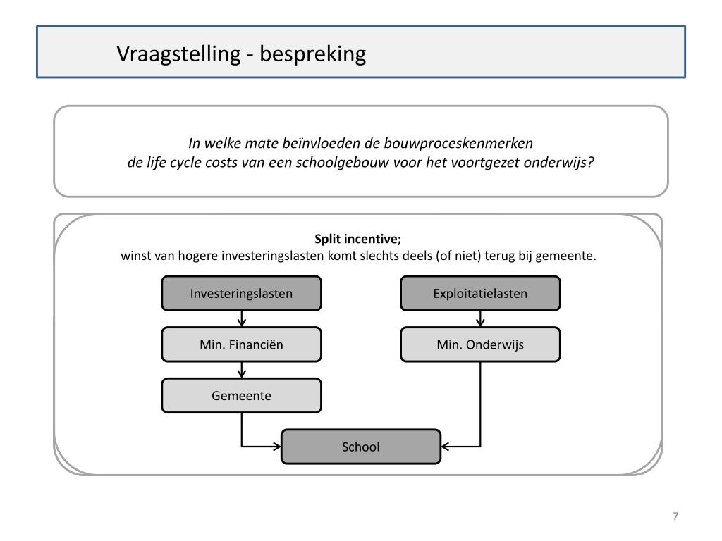 Vraagstelling - bespreking In welke mate beïnvloeden de bouwproceskenmerken de life cycle costs van een schoolgebouw voor het voortgezet onderwijs? Bouwproces-kenmerken Life cycle costs Onderwijshuisvesting