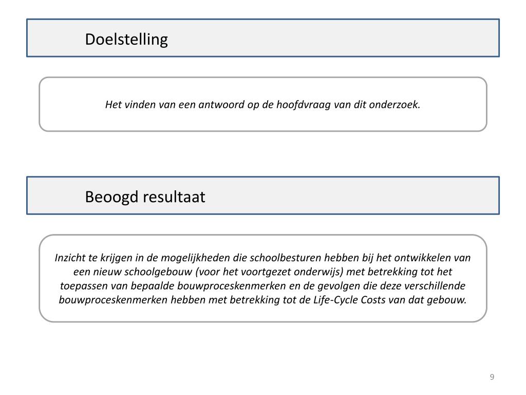Doelstelling Het vinden van eenantwoord op de hoofdvraag van ditonderzoek. Beoogd resultaat Inzicht te krijgen in de mogelijkheden die schoolbesturen hebben bij het ontwikkelen van een nieuw schoolgebouw (voor het voortgezet onderwijs) met betrekking tot het toepassen van bepaalde bouwproceskenmerken en de gevolgen die deze verschillende bouwproceskenmerken hebben met betrekking tot de Life-Cycle Costs van dat gebouw.