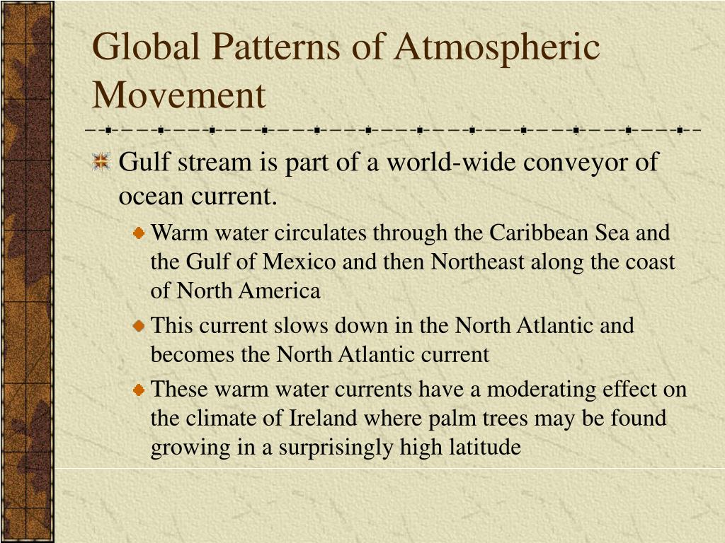Global Patterns of Atmospheric Movement • Gulf stream is part of a world-wide conveyor of ocean current. • Warm water circulates through the Caribbean Sea and the Gulf of Mexico and then Northeast along the coast of North America • This current slows down in the North Atlantic and becomes the North Atlantic current • These warm water currents have a moderating effect on the climate of Ireland where palm trees may be found growing in a surprisingly high latitude